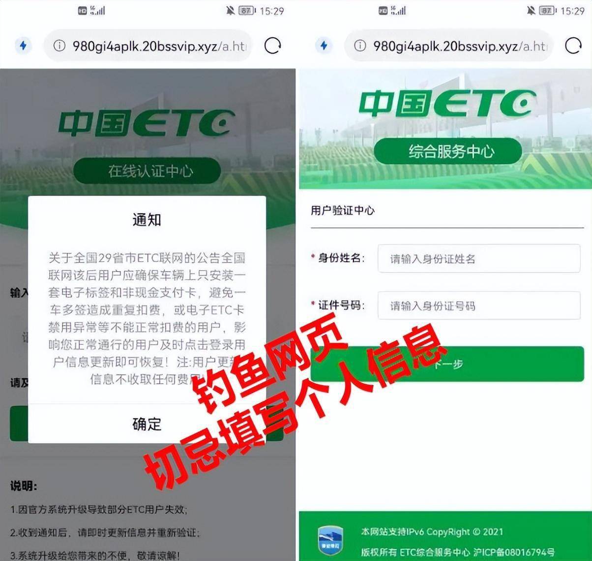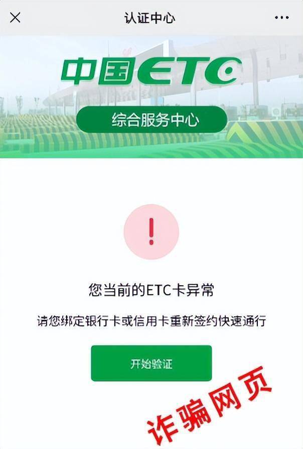诈骗分子以ETC中心、高速管理中心等机构名义发送短信,打着 “你的ETC无法继续使用,想要恢复使用就要重新认证”的借口进行诈骗。