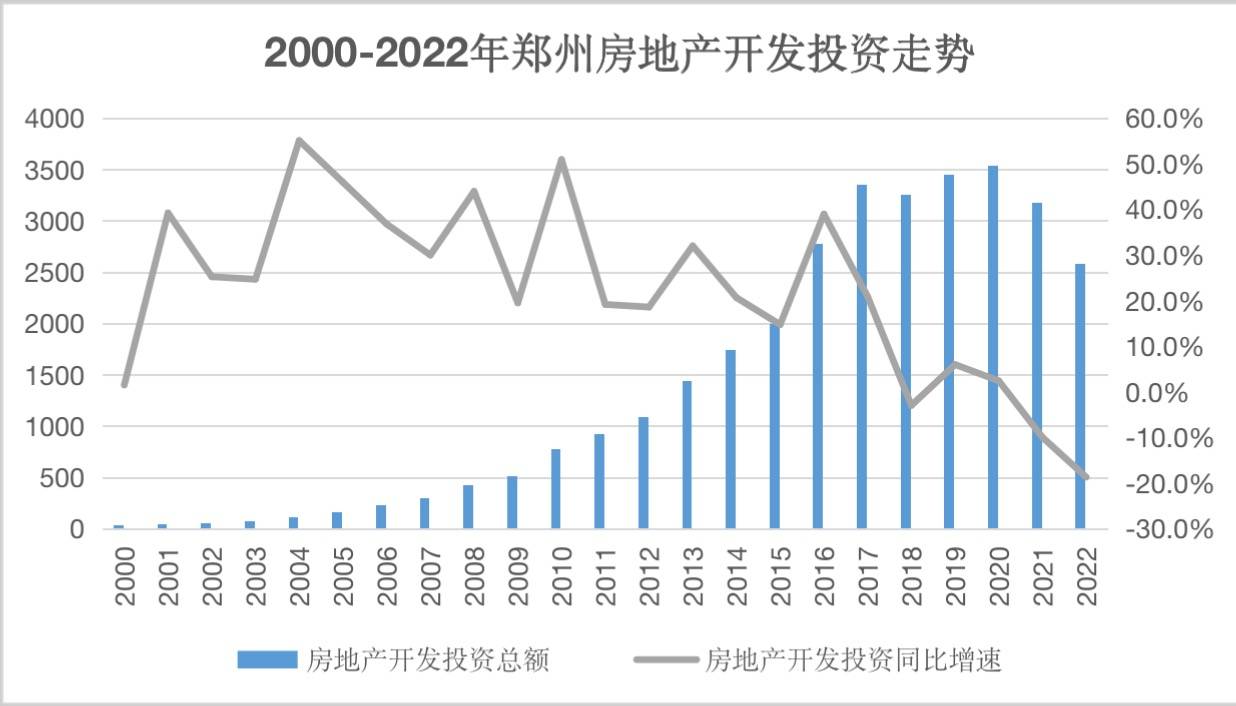 2000年,郑州房地产开发投资规模为34.2亿元,较前一年增长1.5%,2001年这一增幅就猛增达39.2%。此后17年间,郑州每年的房地产开发投资额都呈两位数的增长,且一度高达50%以上。2017年,郑州全市房地产开发投资规模为3358. 8亿元,较17年前增长近百倍。