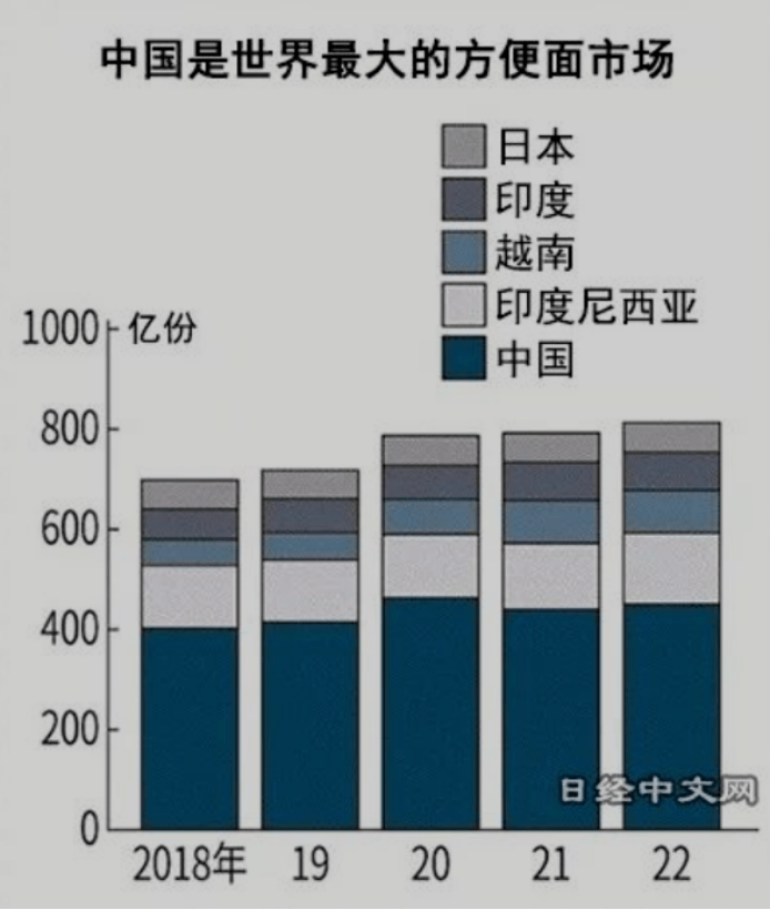 一方面,人口数量摆在那,中国市场太诱人了,2022年中国的方便面总需求为450亿,是第二名印度尼西亚的3倍。