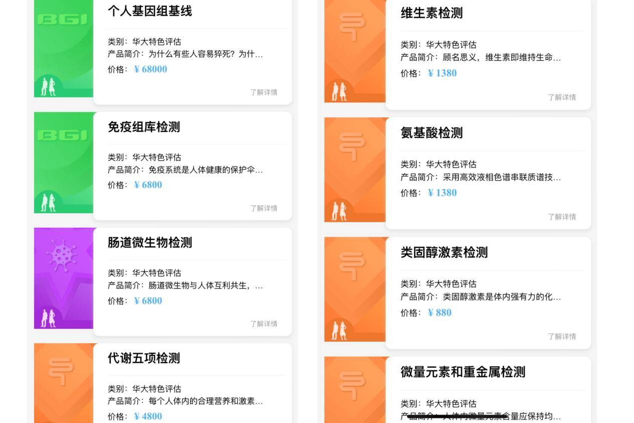 在华大特检的公众号上,目前提供的服务已有二十多种,其中包括个人基因组基线、免疫组库检测、肠道微生物检测、代谢五项检测、维生素检测等;最贵的个人基因组基线价格高达6万8。