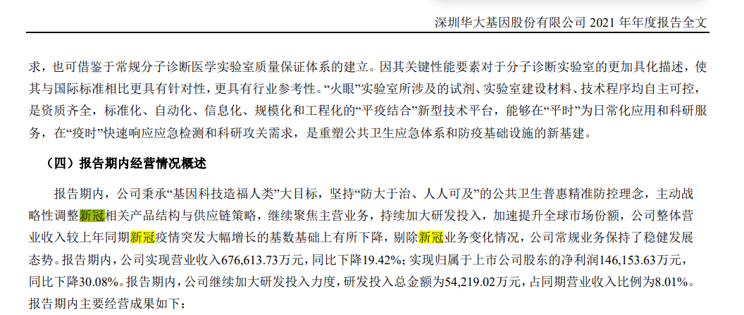 据华大基因解释,主要是非常规业务营业收入同比下降所致。从披露内容来看,非常规业务或主要指向新冠检测业务;2021年年报中,华大基因在表述中对常规业务进行了界定。