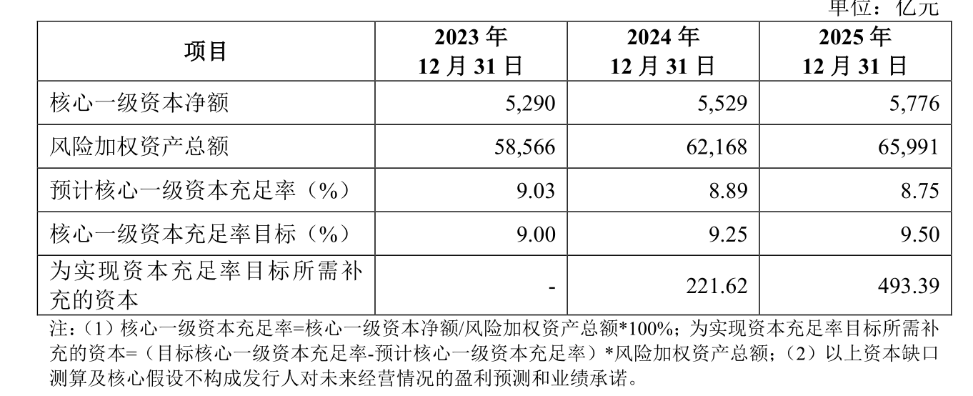 在不考虑本次可转债发行及其他外源性资本补充的情况下,民生银行表示,为满足发行人未来三年的资本充足率目标,预计于2025年末核心一级资本缺口将达到493.39亿元。