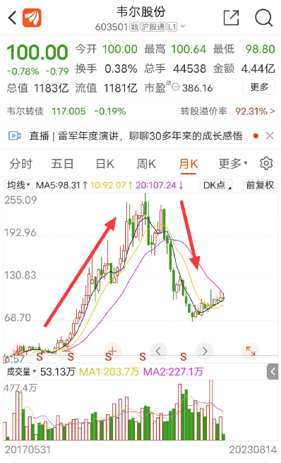目前,韦尔股份股价尽管比高峰时已回落近六成,但截至8月14日收盘最新市值仍有1183亿元,也就是说虞仁荣及其一致行动人质押的市值有约230亿元。