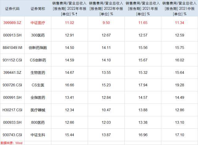 据了解,销售费用是本次医疗反腐明确指出的重点审查环节,销售费用在总营收中占比较高的药企或将成为重点关注。根据过去两年指数中报及年报披露数据,中证医疗指数成份股整体销售费用在营业总收入中所占比例在11%左右,在市场主流的10只医药医疗相关指数中销售费用占比最低。