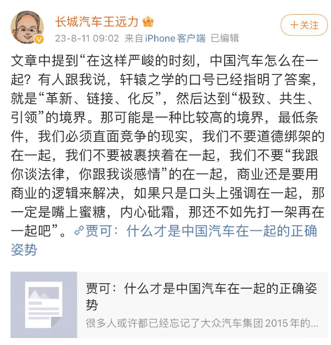 长城汽车最近频繁与比亚迪正面“硬刚”,长城汽车 CTO(首席技术官)王远力8月11日通过个人微博表达了对比亚迪“在一起,才是中国汽车”视频的看法,称中国汽车企业必须直面竞争的现实,“如果只是口头上强调在一起,那还不如先打一架再在一起吧。”