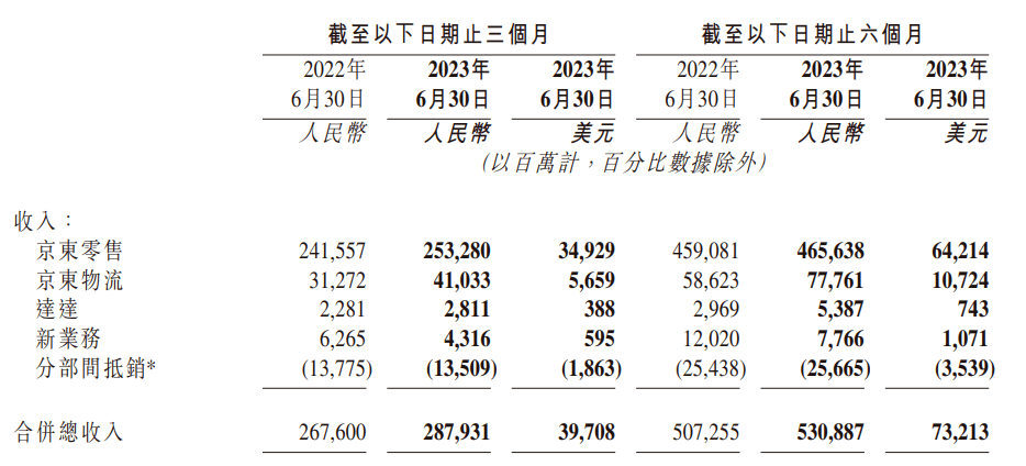 财报显示,京东2023年Q2 收入为2879亿元,同比增长7.6%。作为京东核心业务的京东零售收入为2532.8亿元,同比增长4.85%。