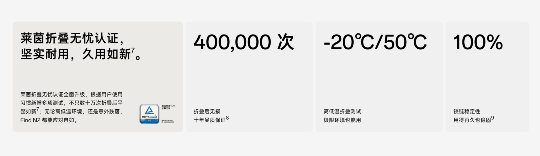 你看像是 OPPO Find N2 就宣称在折叠 40 万次以后,不管是折痕深度也好还是宽度都不会发生本质变化。