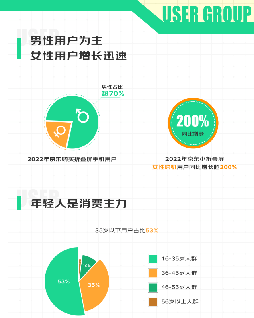 另外京东数据显示折叠屏用户超 5 成是 35 岁以下的年轻用户,2022 年小折叠女性用户增长超 200%,看来对于 “ 尝鲜 ” 这件事,咱年轻人还是当仁不让~