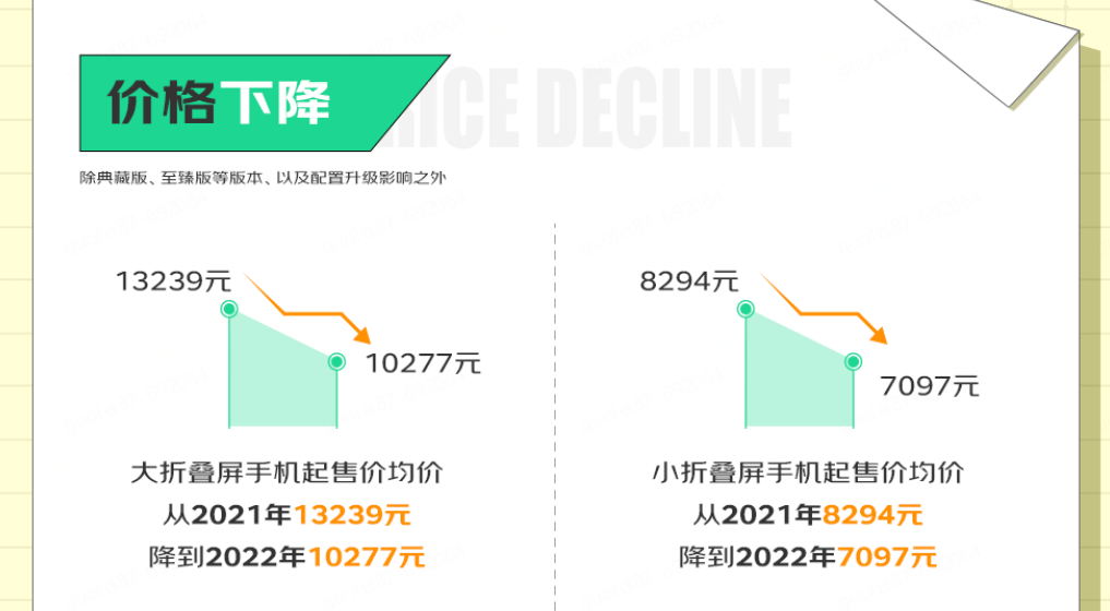 根据图鉴显示,除典藏版、至臻版等版本以及配置升级影响之外,大折叠屏手机( Fold )起售价均价从 2021 年的 13239 元,下降到了 2022 年的 10277 元;小折叠屏手机( Flip )起售价均价则从 8294 元下降到了 7097 元。