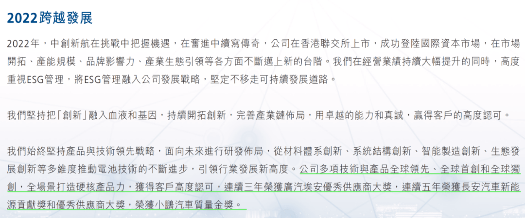 「探客出行」注意到,在2022年年报中的“2022跨越发展”总结到:“公司多项技术与产品全球领先、全球首创和全球独创……连续三年荣获广汽埃安优秀供应商大奖,连续五年荣获长安汽车新能源贡献奖和供应商大奖,荣获小鹏汽车质量金奖。”