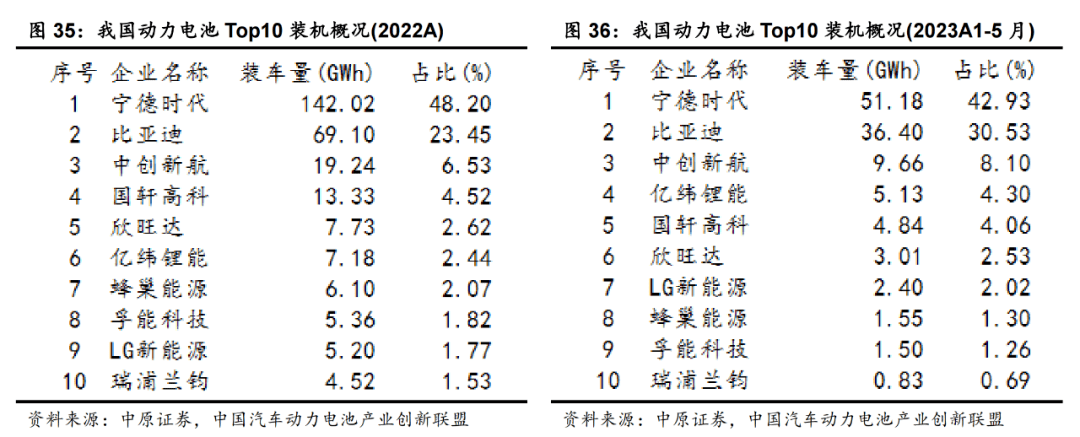 值得注意的是,排名第二位的比亚迪装机量占有率已经从2022年的23.45%迅速提升至2023年1-5月的30.53%,而排名第一的动力电池装机量市占率则从2022年的48.20%下降至2023年1-5月的42.93%。