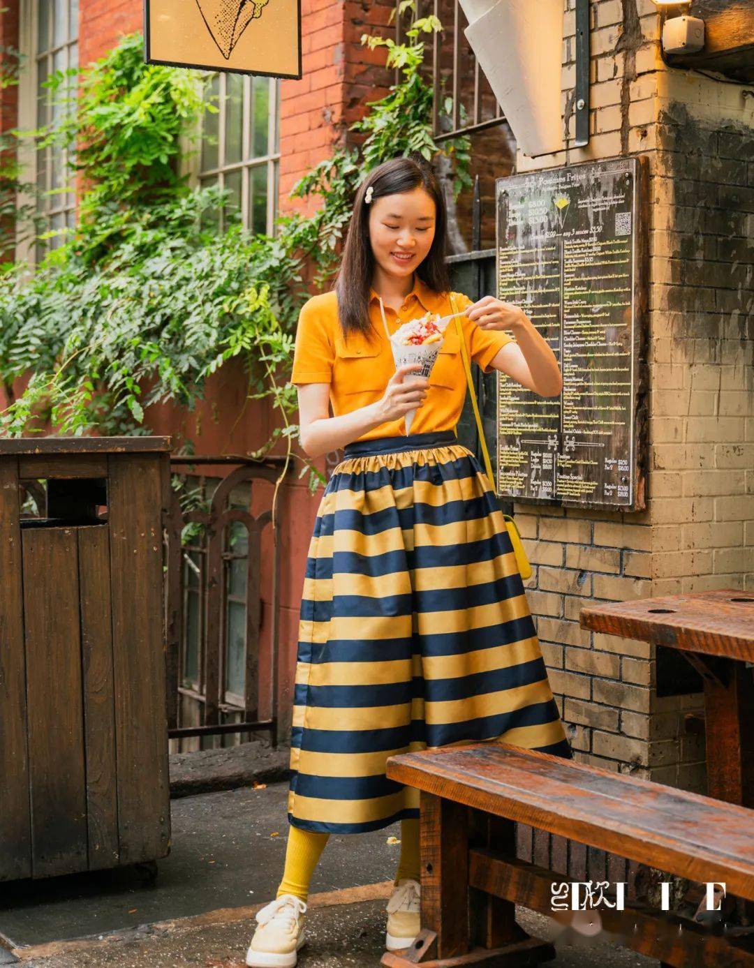 条纹伞裙、柠檬黄手袋 均为Kate Spade