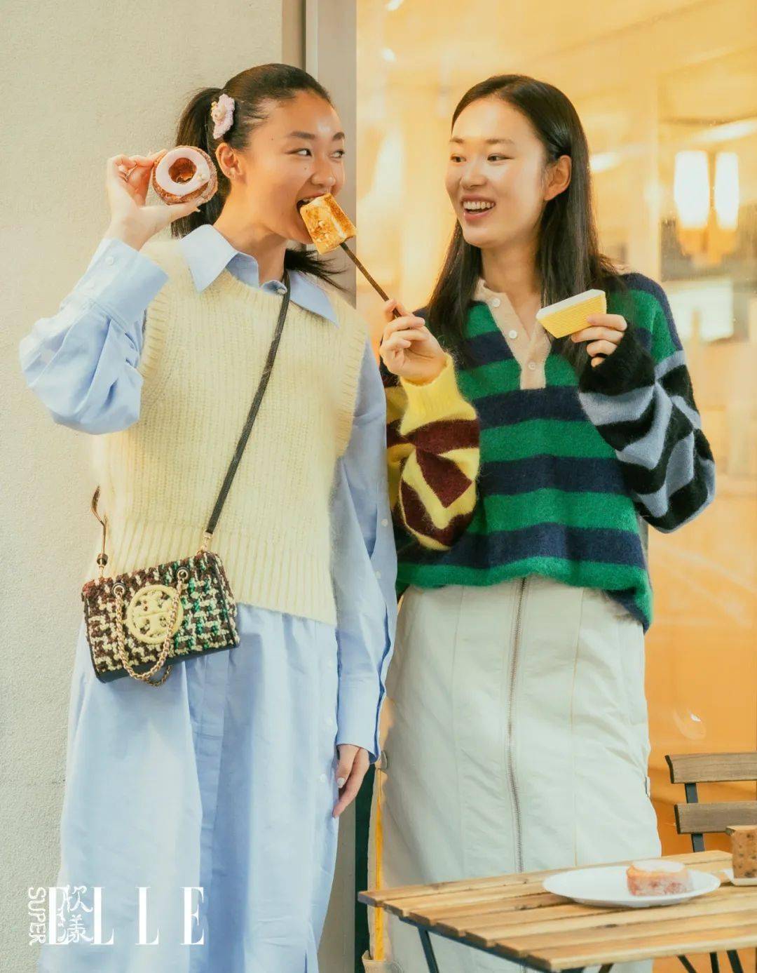 天蓝色衬衫裙、鹅黄色针织背心 均为COS