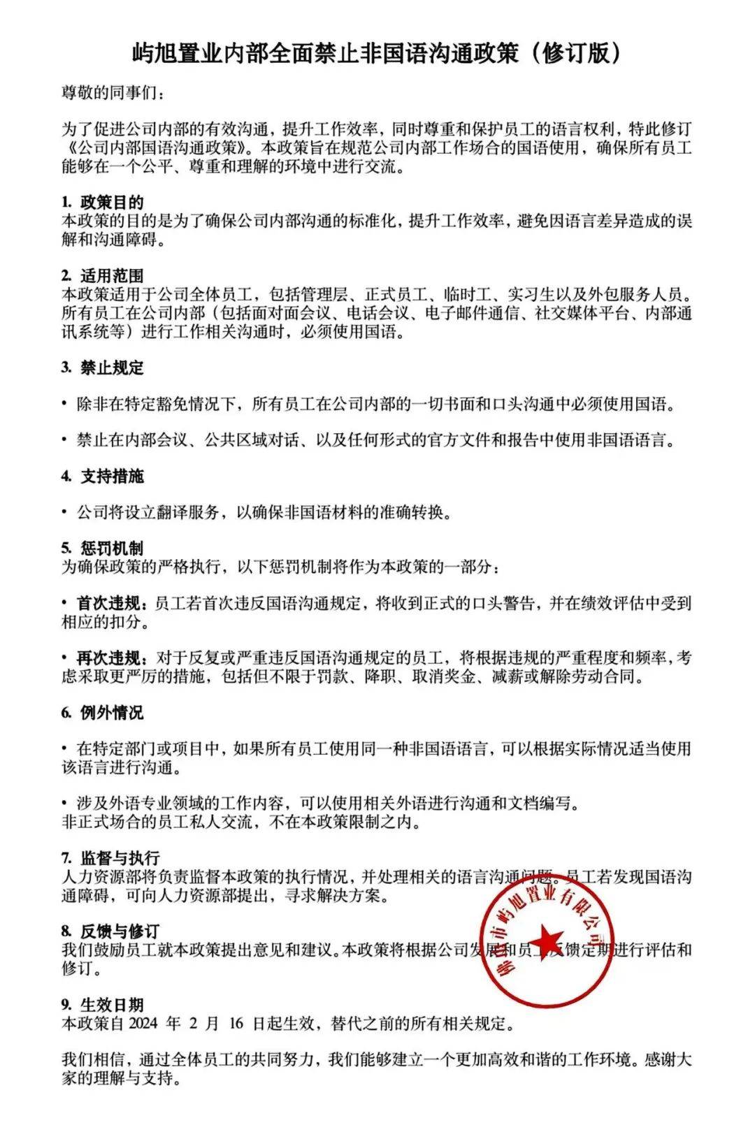 记者注意到,该公司在微博也注册了相关账号并加V认证,在2月16日还发表了文案为“即日开始实行禁止非国语沟通政策”的博文,并晒出具体细则。对此,有网友质疑该公司知法犯法,涉嫌炒作。