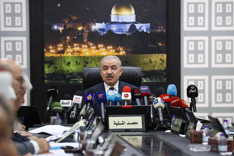 当地时间2024年2月26日,约旦河西岸拉姆安拉,巴勒斯坦总理阿什提耶在政府每周例会上发表讲话并宣布辞职。