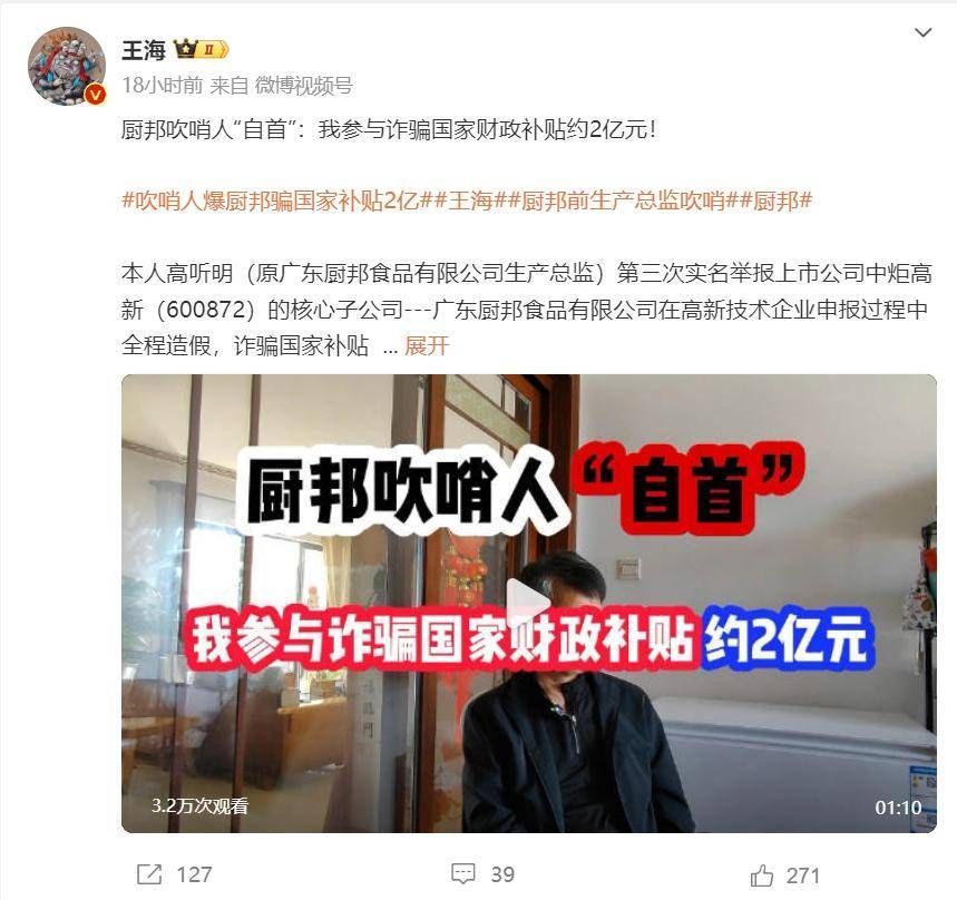 2月29日23时05分,知名打假人王海在其微博贴出厨邦前生产总监高听明实名爆料:姚振华控股的上市公司“中炬高新技术实业股份有限公司”旗下核心调味品企业“广东美味鲜调味食品有限公司”生产的蚝油,蚝油汁仅占1.6%。仅厨邦蚝油一项,涉嫌非法所得将超10亿元。