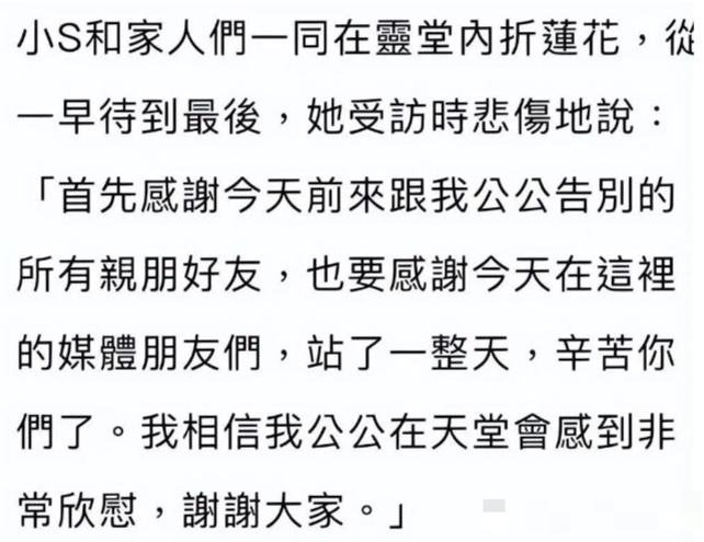 下午五点 ,在小s和丈夫许雅钧守灵7小时后准备离开时,小s接受了短暂的采访。她双手合十加鞠躬向亲朋好友以及媒体朋友表示了感谢。