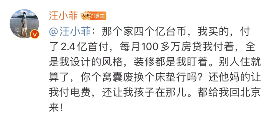 紧接着汪小菲还在评论区透露大s和具㑓晔所住的总价四个亿台币的房子,首付是他付的,贷款是他还的,电费是他付的,就连床垫用的都是之前自己买的。
