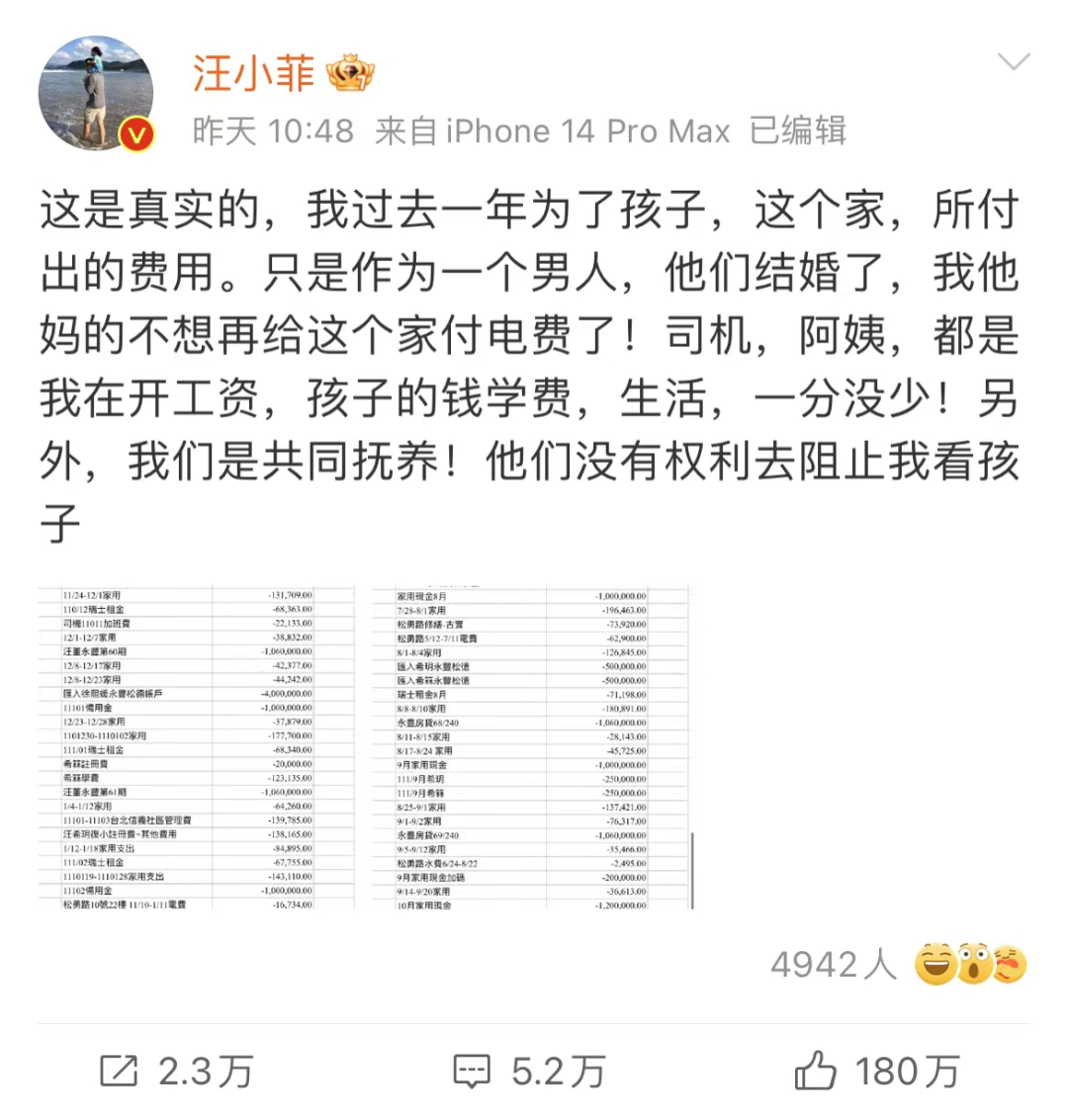 起因是大s以汪小菲不支付赡养费为由把他告上了法庭,结果汪小菲怒甩账单力证清白。然后就有了那个微博热搜“我他妈再也不想为这个家付电费了”。
