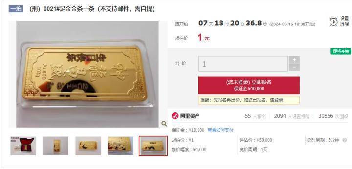 以“0021#”拍卖对象为例,这条正面为浮雕龙图案的足金金条重100克,在标的物介绍中,对其描述为“经多点检测金含量Au999‰,检测仅针对样品表面,龙身表面有轻微氧化痕迹,反面刻有‘神龙昌盛’‘Au999’字样,整体品相佳”。其评估价是5万元,折下来为500元每克。部分饰品的评估价格还要低一些,为480元每克左右,和目前黄金回收价差不多,甚至略低。