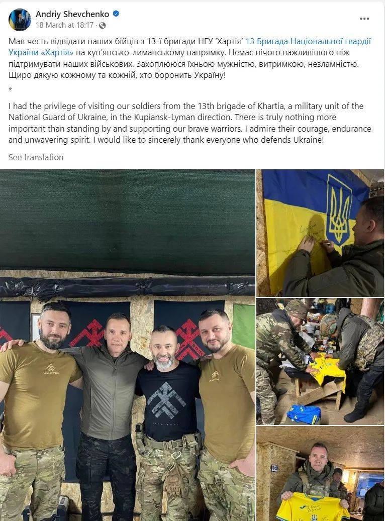 - 网传说法不实,图片实为乌克兰足协主席舍甫琴科近期去前线探望士兵的照片,并不代表其加入前线战斗。