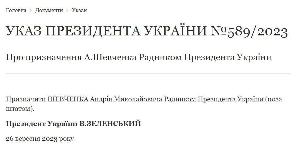 - 舍甫琴科担任乌克兰United24机构大使,该机构旨在俄乌冲突后为乌克兰筹集捐款。2023年,泽连斯基任命舍甫琴科为乌克兰总统顾问。