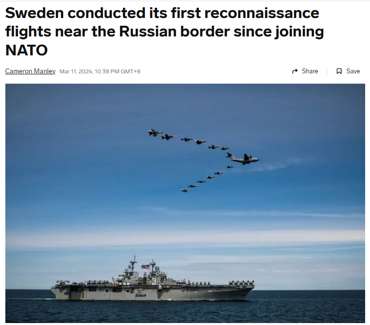 接着,美媒爆料称,上周六(3月9日),也就是瑞典加入北约仅仅两天之后,瑞典空军就在俄罗斯边境进行了自加入北约以来的首次侦察飞行。