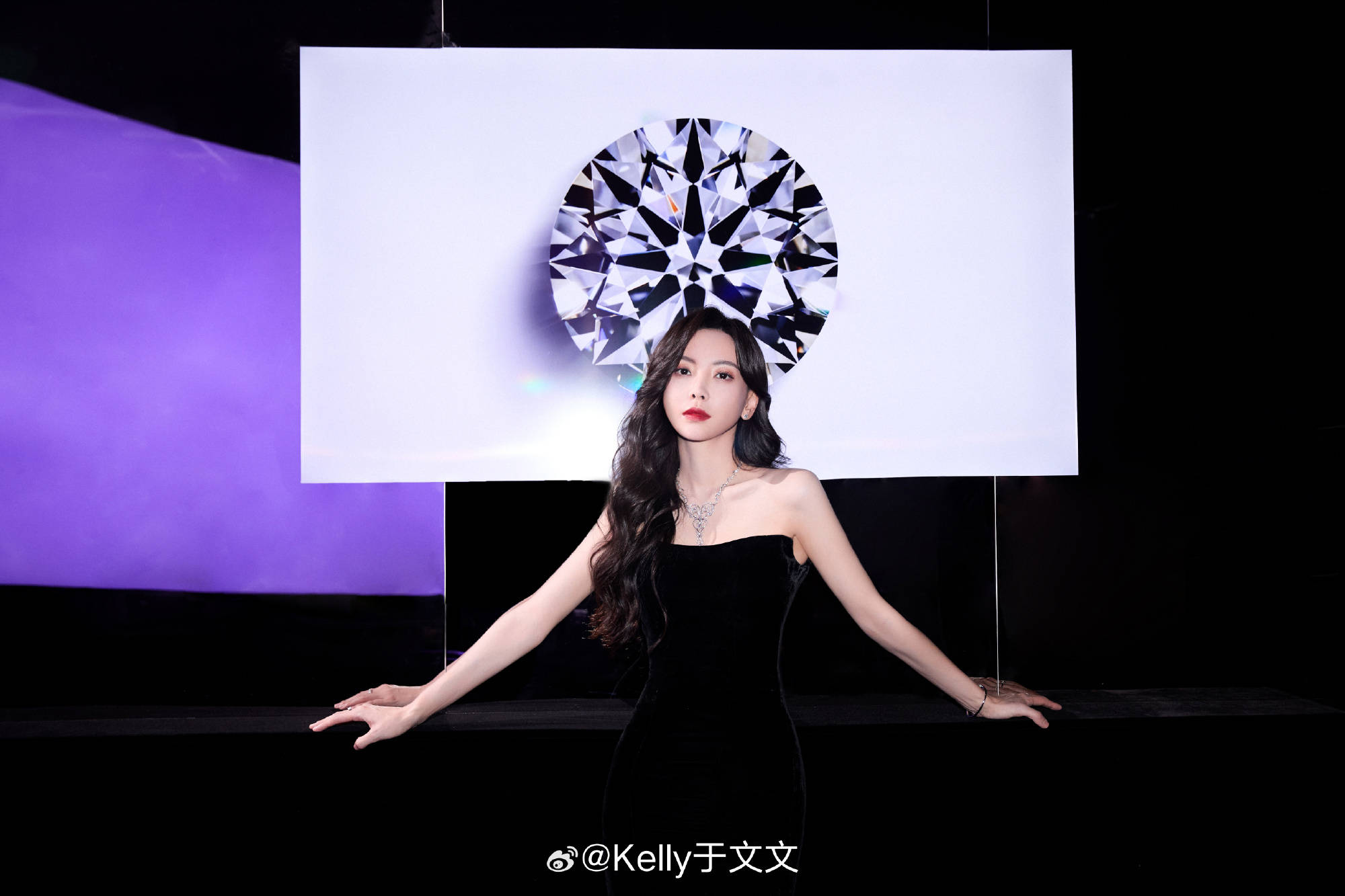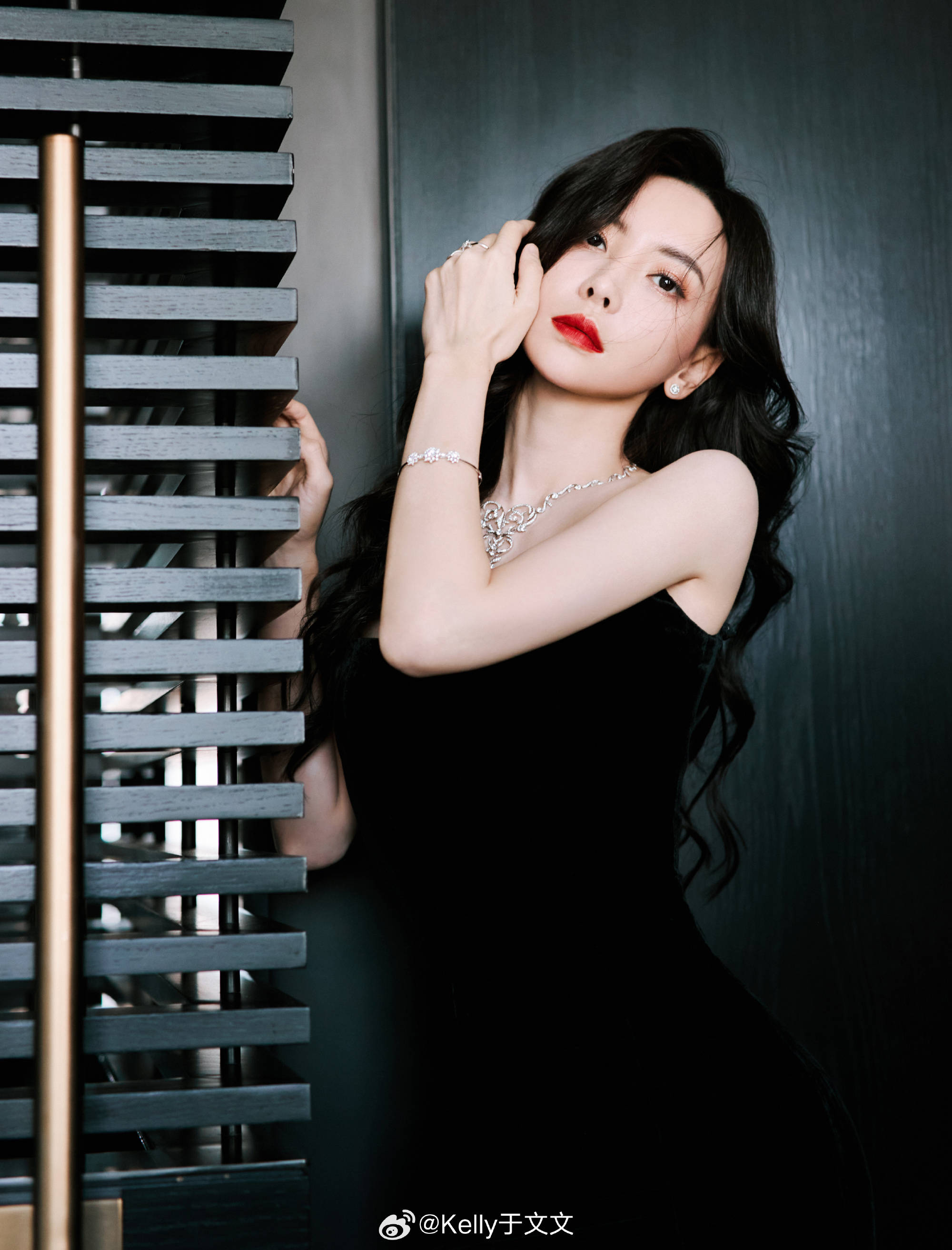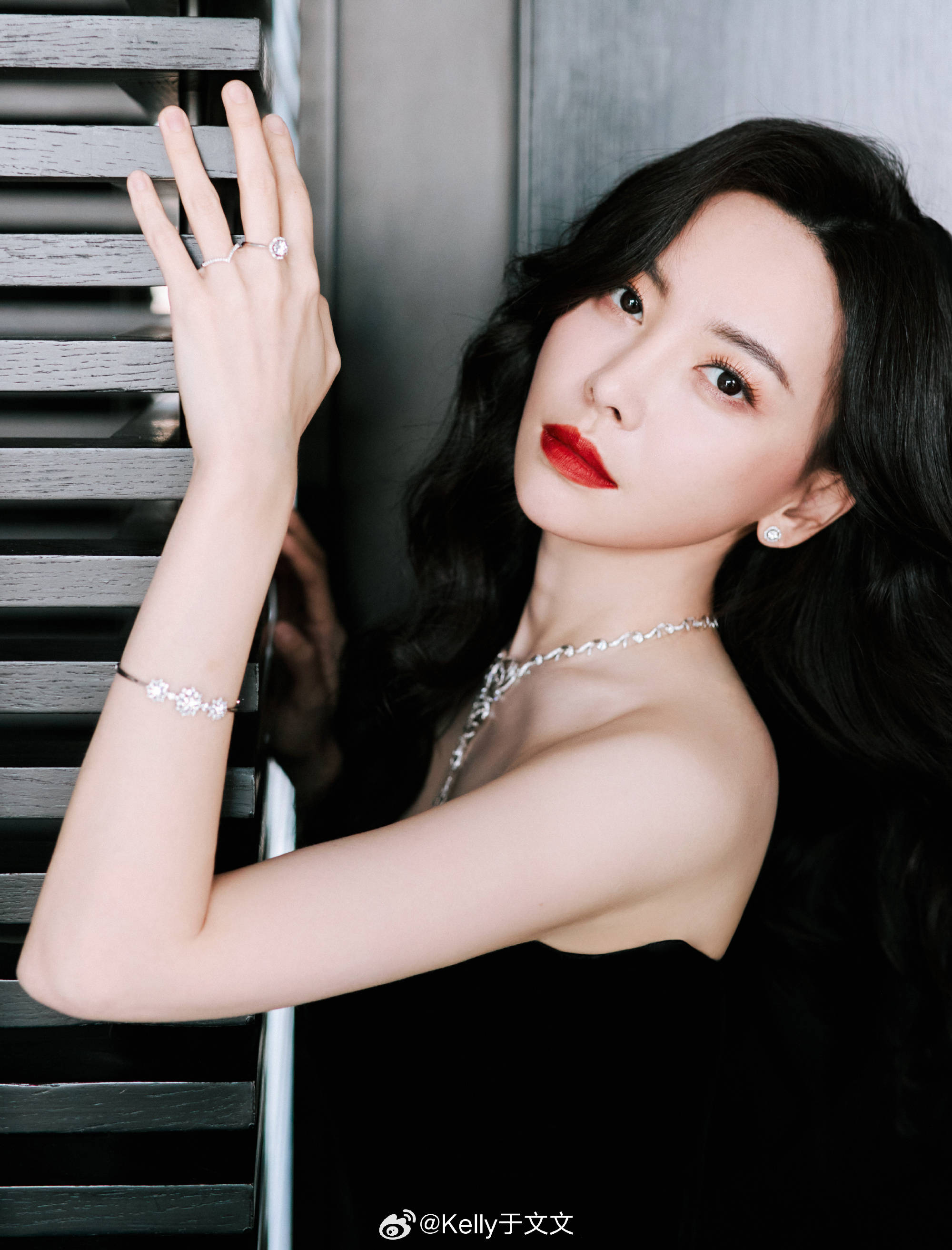 于文文:我佩戴珠宝的时候主要是来搭配服饰,比如说我今天选择了一条非常简约的一字领连衣裙,那我就会搭配周生生的这一款欧式典雅系列的长钻项链,还有我们的光环系列的一对非常小巧的耳环。