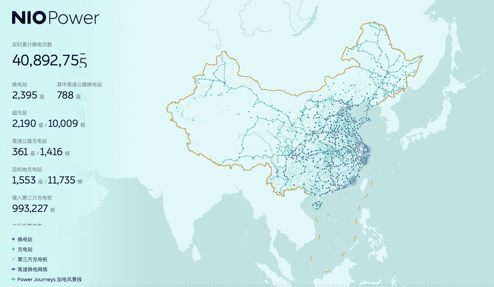 官方信息显示,截至3月27日,蔚来共建设超充站2,187座、高速公路充电站361座、目的地充电站1,553座,接入第三方充电桩1,010,655根。而在换电站领域,蔚来共计建设换电站2,393座,换电次数超过4000万次。