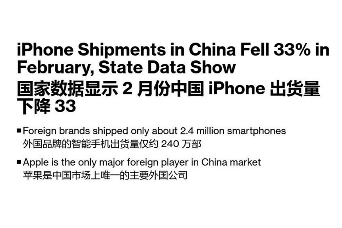 最近一段时间有媒体发文说,苹果iPhone在中国的出货量,1月同比暴跌39%,2月同比暴跌33%。