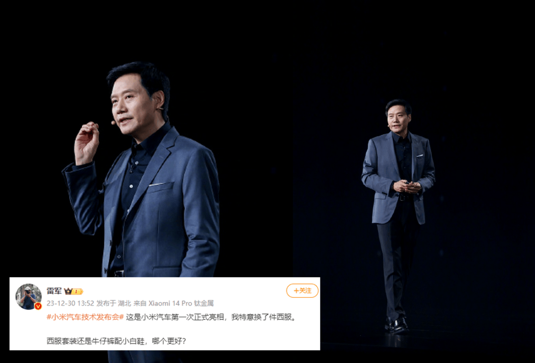 这次发布会彩排时,穿的灰蓝、浅灰两身西装,颜色正好呼应了小米汽车的配色“流星蓝”和“雅灰”,穿衣用心程度在大佬中堪称第一。
