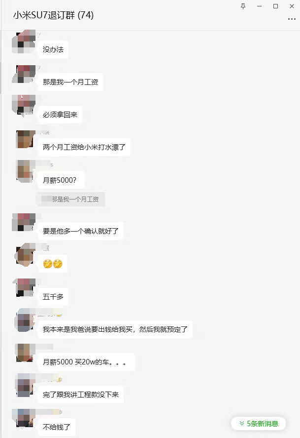 更惨的群友讲起了故事,称原本他爸说要给他买SU7,他自己去下定,结果因为工程款没下来,金币没有爆出来,十分尴尬。小部分群友称已经成功退款,小通认为可信度一般。