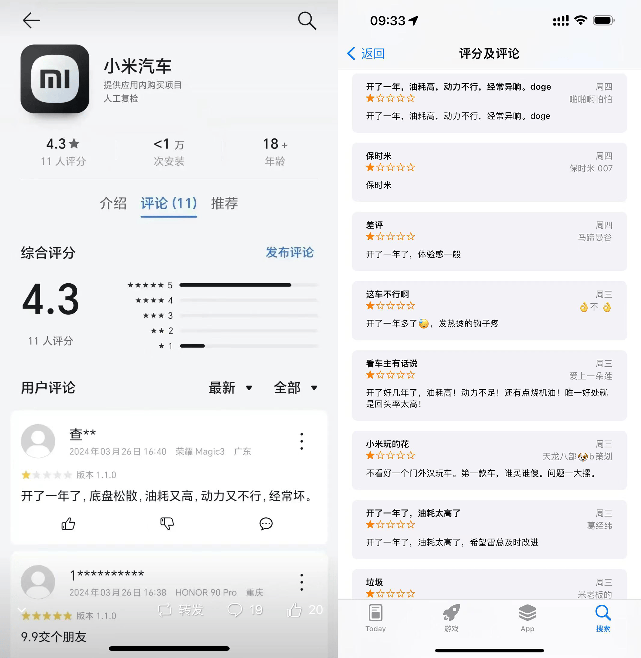 明眼人都能看出,小米汽车这是被竞争对手盯上了,虽说这批「水军」的质量不太高,但已经起到拉低评分的作用,分数越低则降低应用商店的评级,导致榜单的搜索排名下降,甚至会引来官方审核,存在被要求下架的可能性。