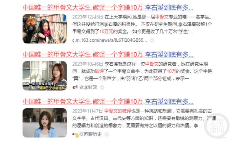 按照李右溪的提示,记者在网上进行了搜索,发现这些不实传闻来自“扶苏聊历史”、“老李财郑”、“简读视觉”等自媒体。有的在文中写道:“李右溪,中国唯一的甲骨文大学生”“她曾经在研究生期间,成功破译了一个甲骨文单字,为此获得了10万的奖金”,有的则是夸张描述:“不仅在研究生期间,李右溪靠破解1个甲骨文得到了10万元的奖金。如今更是收了几十万名‘学生’来一起学习甲骨文。”