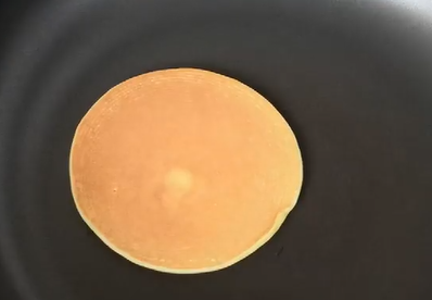 接着舀一勺调好的玉米面糊糊,用不粘锅,不需要放一滴油,只要慢慢的倒玉米面糊糊,它自己就会蕴成一个圆形的玉米面饼。