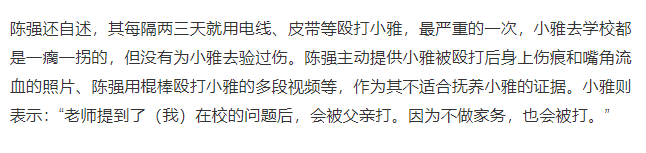 小陈在法庭上满不在乎地表示,他每隔两三天就会这样打小雅,有时候是因为小雅没做作业,有时候仅仅是因为没做好家务。